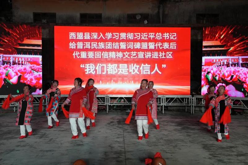 编者按 为深入学习贯彻习近平总书记给普洱民族团结誓词碑盟誓代表后代的重要回信精神,进一步引导全县广大干部群众把思想和行动统一到重要回信精神上来,共同当好“收信人”。12月9日-18日,西盟县深入学习贯彻习近平总书记给普洱民族团结誓词碑盟誓代表后代的重要回信精神“文艺轻骑兵”小分队宣讲将进农村、进基层、进企业、进校园、进军营、进社区、进乡(镇),让习近平总书记的重要回信精神传遍西盟佤山,引导全县各族人民把中华民族共同体意识牢记心间、融入血液,共守祖国疆土、共建美好家园,让民族团结进步之花越开越绚烂。