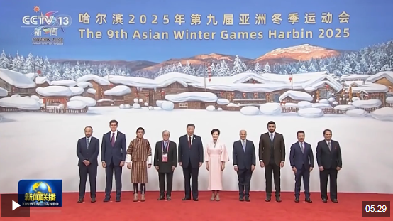 △习近平主席夫妇同出席开幕式的国际贵宾在这里合影留念。(总台央视记者李增仁拍摄) 习主席在欢迎宴会上致辞时指出,哈尔滨是中国现代冰雪运动的发源地。“冰天雪地也是金山银山”,冰雪文化和冰雪经济正在成为哈尔滨高质量发展的新动能和对外开放的新纽带。 △视频:习近平和彭丽媛为出席哈尔滨第九届亚洲冬季运动会开幕式的国际贵宾举行欢迎宴会 这是哈尔滨时隔29年再次举办亚冬会。本届亚冬会充分吸收“哈尔滨”元素,比如,吉祥物“滨滨”和“妮妮”原型选自东北虎林园内两只可爱的小东北虎,取名寓意“哈尔滨欢迎您”。会徽和火炬都融入了丁香花元素,而丁香正是哈尔滨的市花。 欢迎宴会开始前,贵宾们还欣赏了黑龙江非物质文化遗产展示。