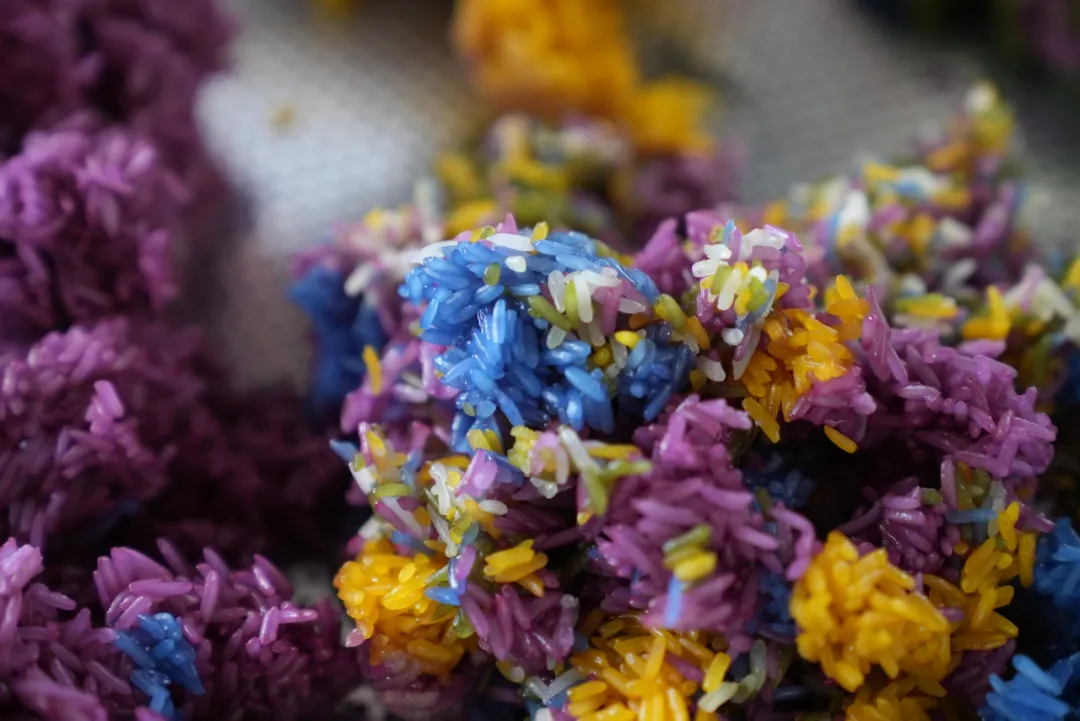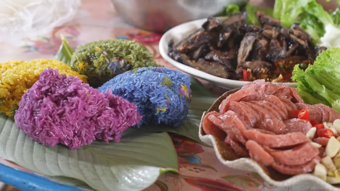 新鲜采摘或是晒干的紫兰草、染饭花、蓝雀花、娘惹花煮沸的汁水,用来浸泡糯米4小时以上,再用蒸笼蒸熟。揭开锅盖,扑鼻而来的糯米香掺着植物特有的清香,黄的、紫的、蓝的、绿的,米粒软糯清透、粒粒分明、色泽鲜艳,搭配上新鲜的烤鱼、烤肉、腌肉,一口糯米、一口肉,不同的口感在舌尖绽放,唇齿留香,色、香、味皆可兼得!
