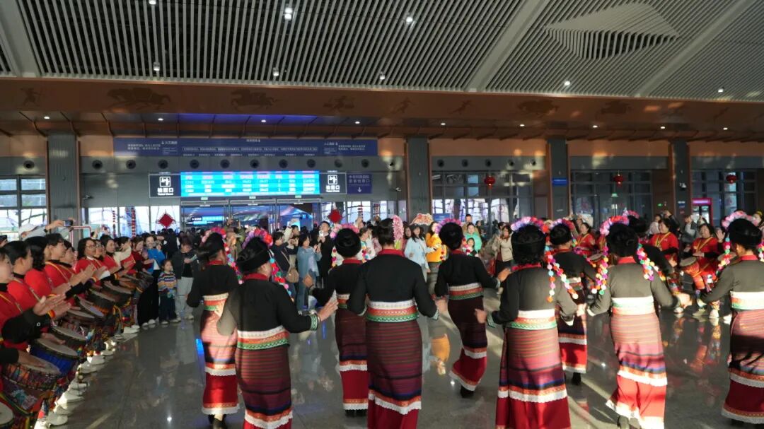 候车大厅内的民族表演吸引了旅客驻足观看。