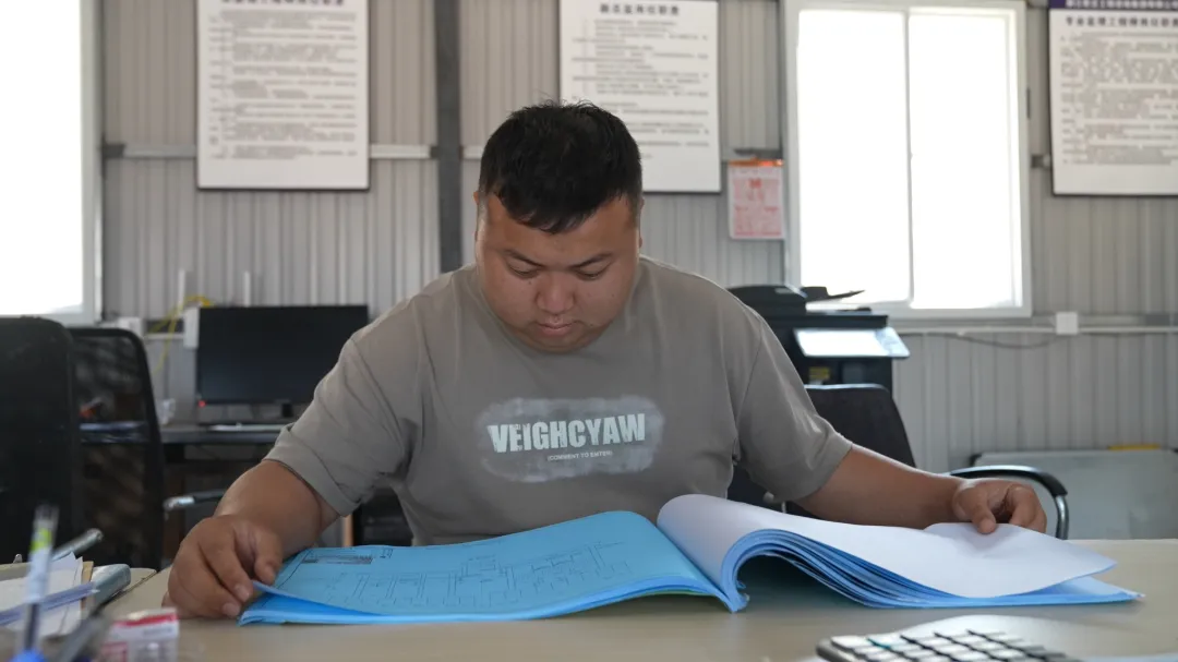 与室外的火热景象不同,办公间内则是一派静谧的景象。技术人员摊开施工图纸,目光在管线走向与高程标注间来回穿梭,不时用铅笔在图纸上勾画标记,对关键施工节点和验收要点进行反复推演。一旁的电脑屏幕上,数字管理平台界面清晰呈现着工程进度、物料调配、人员安排等实时数据,鼠标轻点间,各项信息便完成更新与同步。图纸上的每一次标注、平台上的每一次操作,都关系着下一步施工的精准推进。